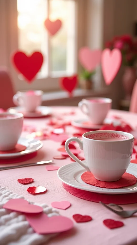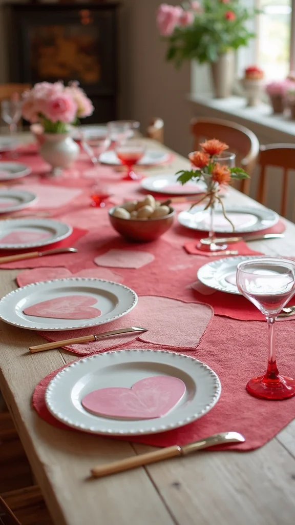These placemats bring a playful touch to Valentine table decor. DIY heart-shaped placemats feel personal and warm. Cut shapes from felt, fabric, or sturdy paper in reds, pinks, or soft neutrals. Bloggers showcase this craft as a cozy, homemade touch for the table.