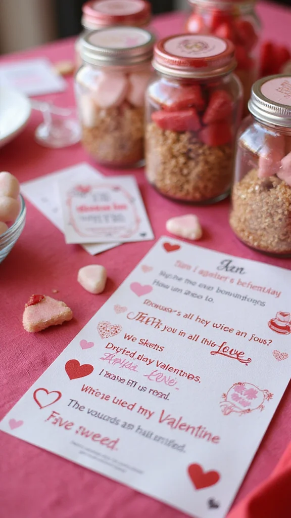 Desserts double as decor and dessert. Clear jars show colors and textures. Candies in pinks and reds create a Valentine vibe. A small sign with flavor names adds whimsy.