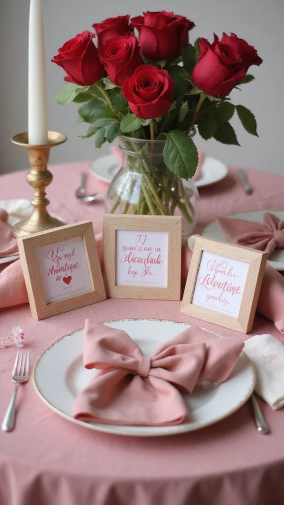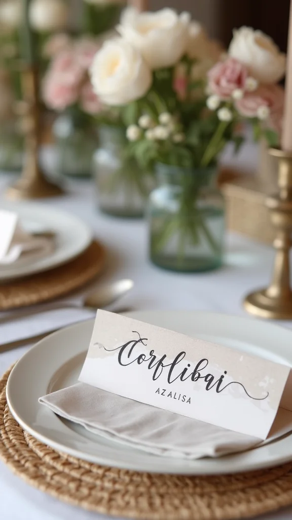 Place cards show care and structure to the meal. Write names with a calligraphy pen for elegance. Add hearts or flowers to tie into the theme. A small note or treat attached makes it special.