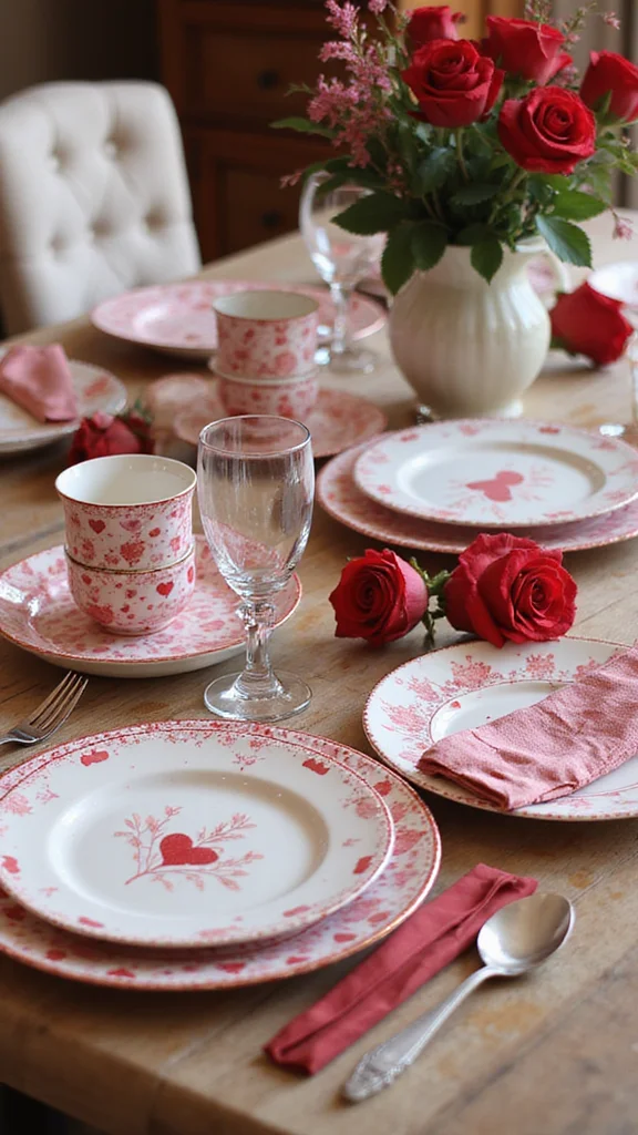 Heart motifs on dishes bring playful energy to the scene. Subtle patterns or quotes can suit any style. From fine china to casual disposables, you can layer easily. Pair with colored chargers for contrast.