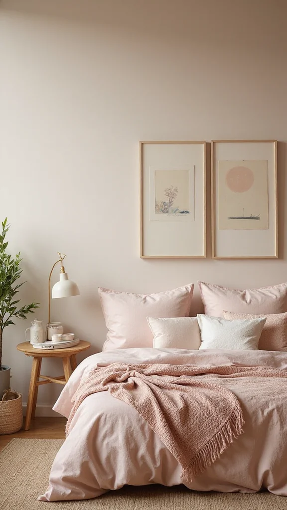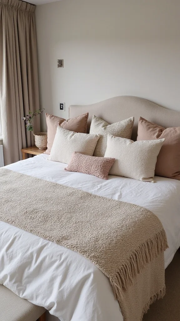 Think tactile, not fussy. Velvet or satin upholstery on the headboard or cushions adds luxe; boucle or chenille throws bring warmth; faux fur accents create coziness; knit blankets add softness. Layer different textures: velvet headboard, boucle pillows, a faux fur throw, and a chenille rug. Use these to create depth and warmth while staying cohesive with blush, ivory, and champagne tones. This is perfect for cozy bedroom textures in romantic bedrooms.