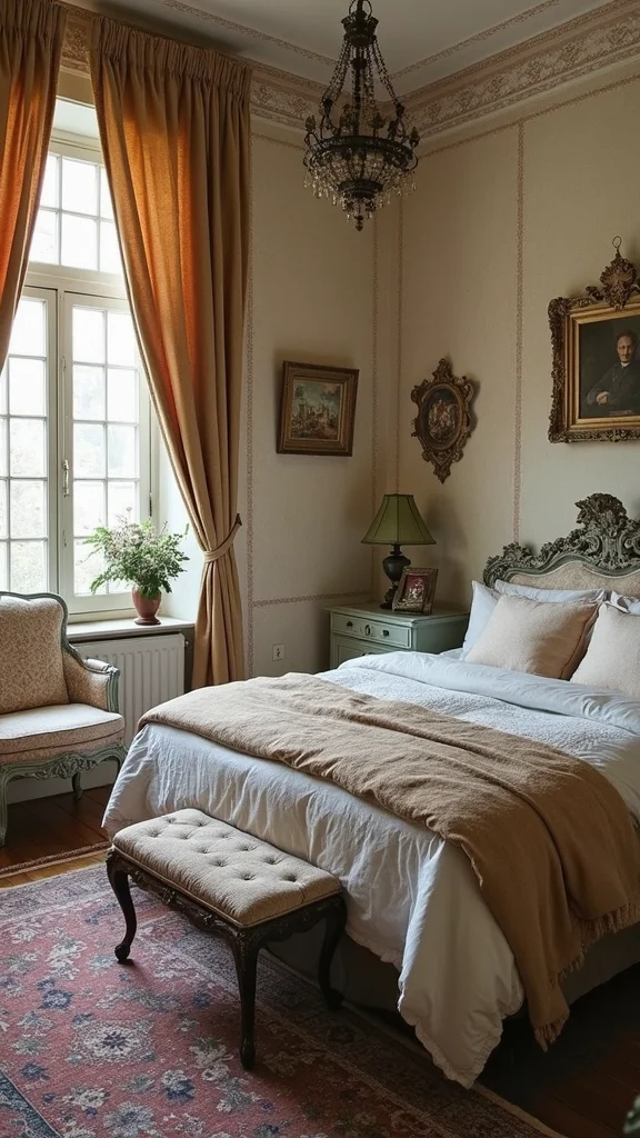 Vintage pieces give romance a timeless glow. Seek carved details, soft curves, and worn finishes that tell a story. A wooden bed with an ornate headboard anchors the room. Pair with a vintage chest or dressing table that carries character.