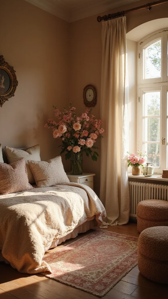 Start with a warm color palette—creamy ivory, blush pink, champagne—and choose a focal vintage piece like an upholstered headboard or lace curtains. Then add mood lighting with dimmable lamps, string lights, and a few scented candles. Finish with tactile textiles such as velvet pillows, boucle throws, and a textured rug to anchor the space.