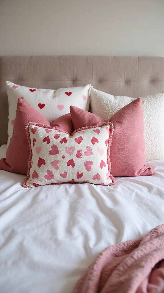 Romantic throw pillows add color, texture, and comfort. Mix pillows with hearts, words, or floral prints to fit the Valentine vibe. Layer large back pillows with smaller fronts for depth. A touch of velvet or other luxe textures makes the space feel inviting and soft.