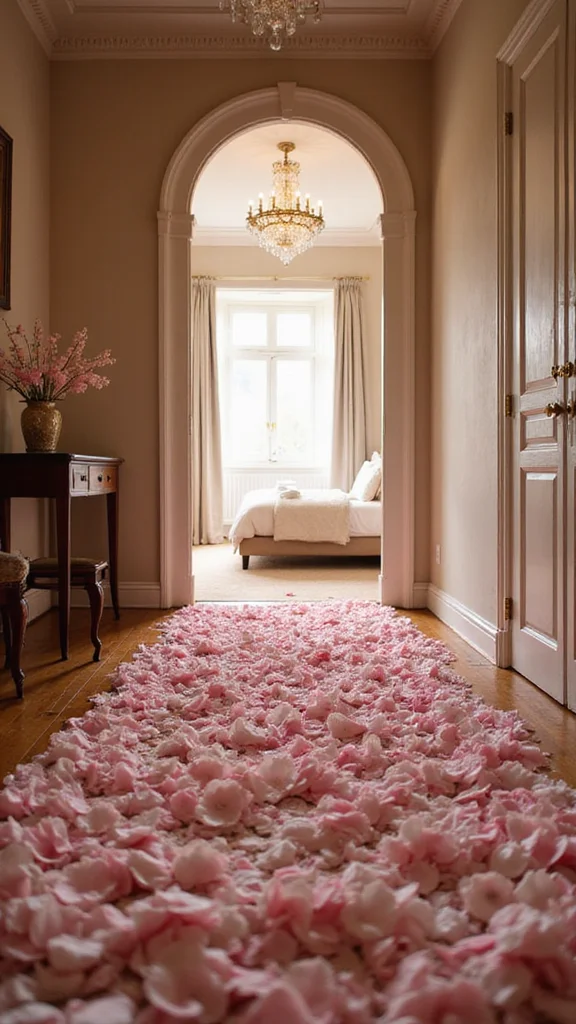 A soft petal path leads from the door to the bed for a refined entrance. Real petals feel lush, but faux petals work too. Scatter them evenly to create a lush track and enhance the romantic mood. Light candles along the path for extra warmth and glow.