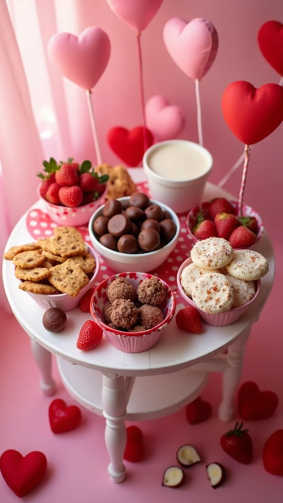 A sweetheart snack station adds a playful bite to the night. Use a small table with a pretty tray and fill it with chocolates, fruit, and bite sized treats. Include heart shaped cookies or chocolate covered strawberries to stay on theme. Add a fun drink in cute glasses to complete the setup.