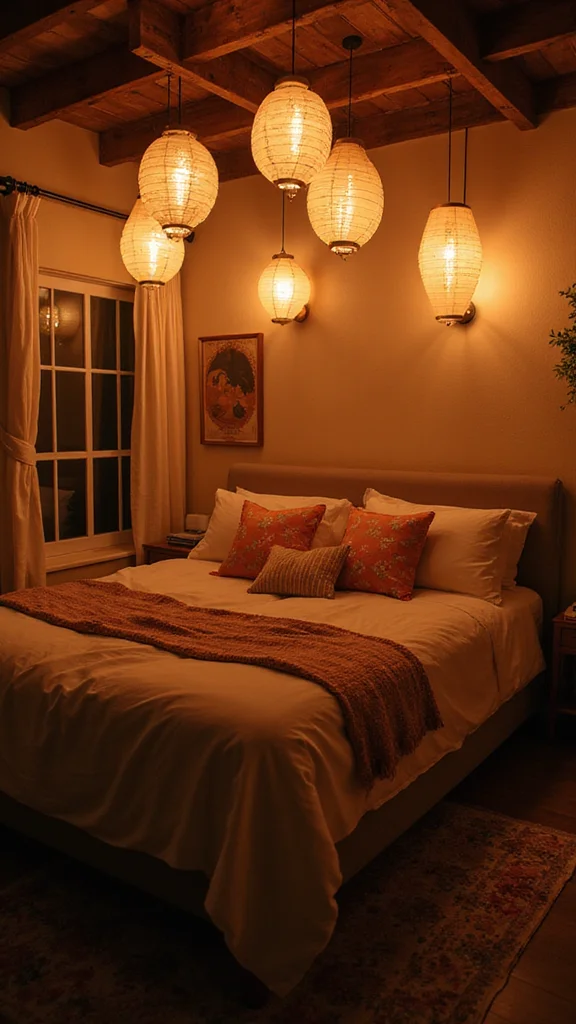 Soft paper lanterns add a gentle glow to the room. Hang them from the ceiling or group them on shelves for a warm vibe. Use LED inside to stay safe and avoid heat. The look feels dreamy and almost magical, perfect for a romantic night.