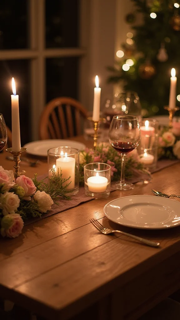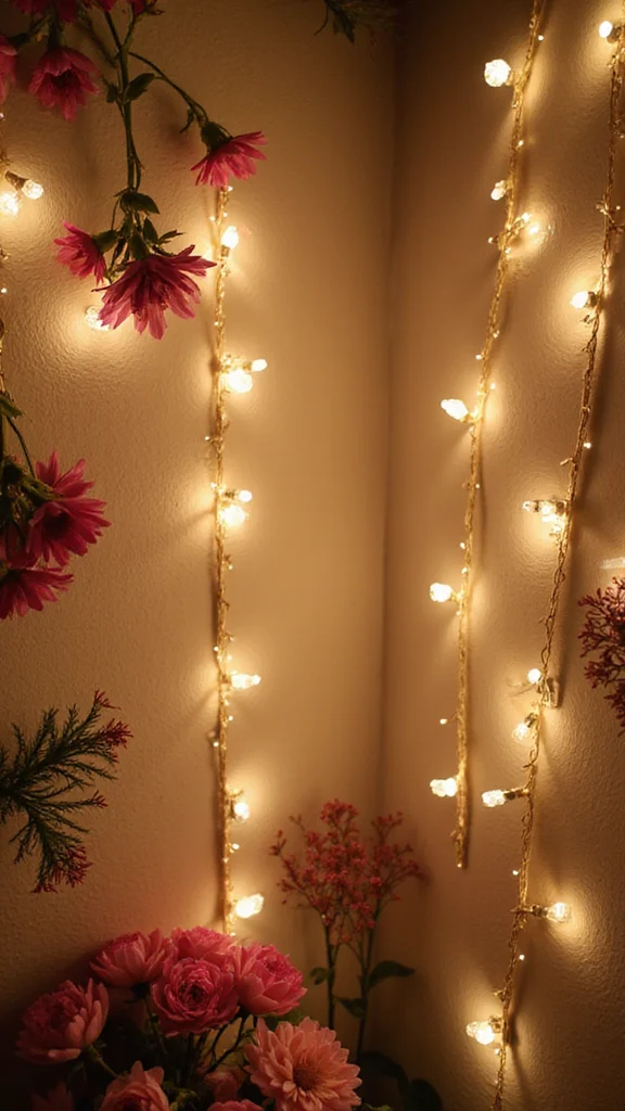 Pair with soft festive lighting ideas—think warm string lights, fairy lights, or a light curtain—to create a romantic glow.