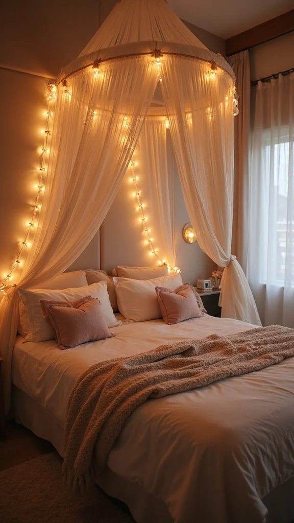 This canopy frames the bed with a soft romantic glow. Sheer blush and white fabrics keep the room airy and elegant. Fairy lights along the edges cast a warm halo, a trend you’ll see in Pinterest bedrooms. It instantly creates a private, dreamy space for two.