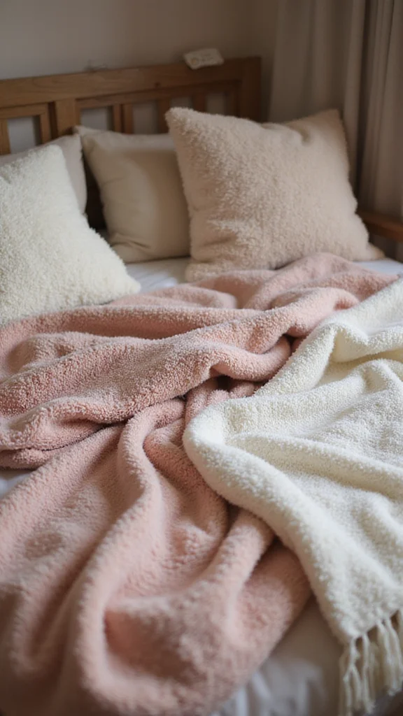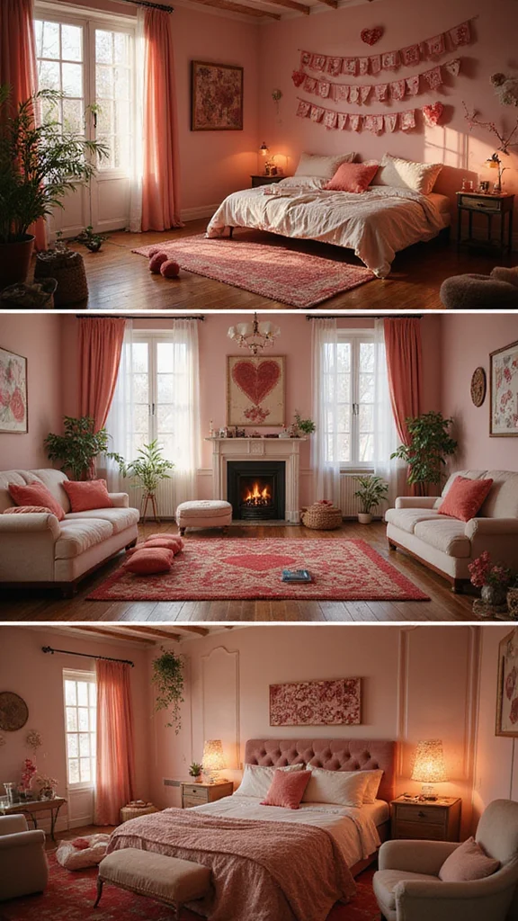 Layer bedding with soft throws and plush pillows. Mix faux fur, knits, and cotton in a romantic palette. Drape throws over the bed or sofa and add heart-shaped pillows for charm. The feel should be soft and inviting.