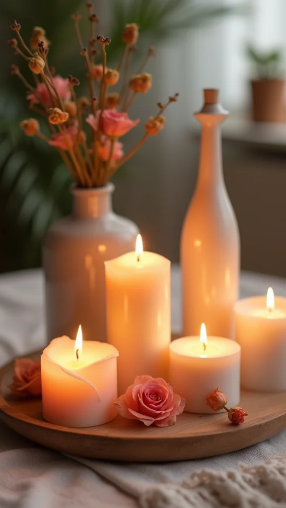 Use varying heights to add visual interest. Lavender or vanilla scents feel calming and cozy. Always supervise candles and consider flameless options if needed. This glow helps perfect intimate moments at home.
