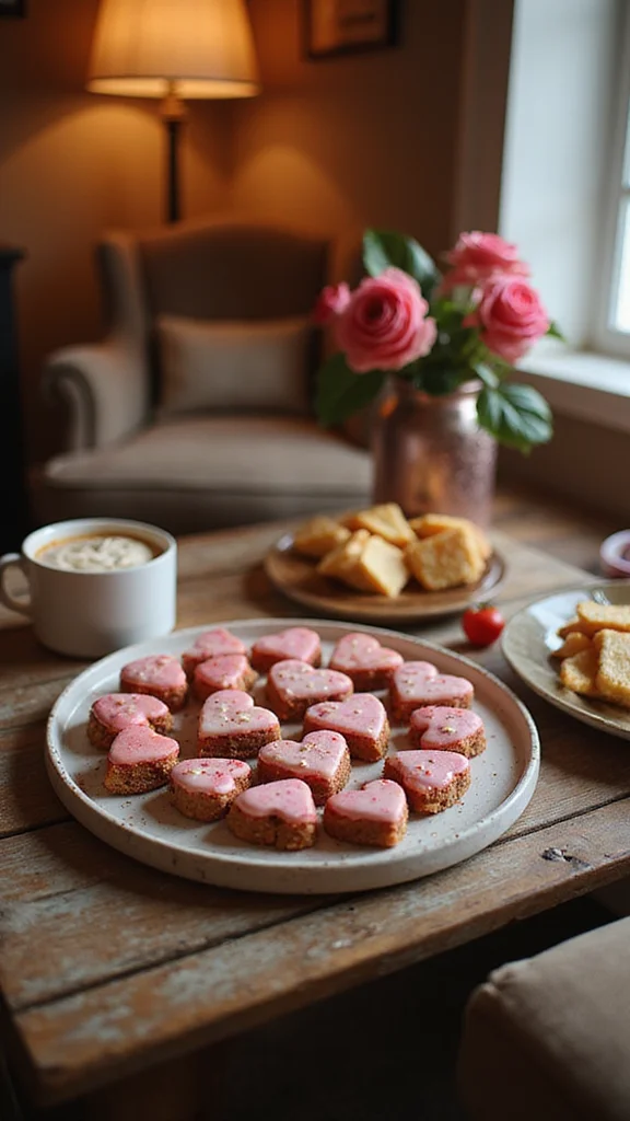 This mini station brings a playful Valentine mood to your room. A chic tray helps keep treats within easy reach. Think chocolate strawberries, heart cookies, and popcorn in pinks and reds. It looks inviting and perfect for sharing.