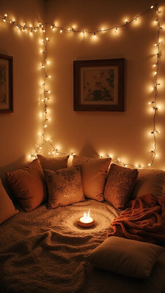 A corner can become a snug retreat with blankets, cushions, and soft lights. This nook invites cuddling during a movie or quiet reading. Drape fairy lights for a gentle shimmer and place scented candles nearby for mood. It feels intimate yet totally doable in small rooms.