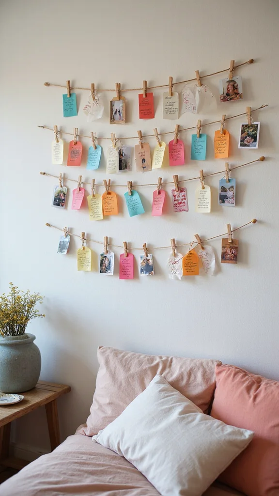 A wall of love notes creates a living diary you both share. Colorful sticky notes or handwritten cards flutter on a string with clothespins. It invites memories, dream dates, and inside jokes. It also grows as your story does.