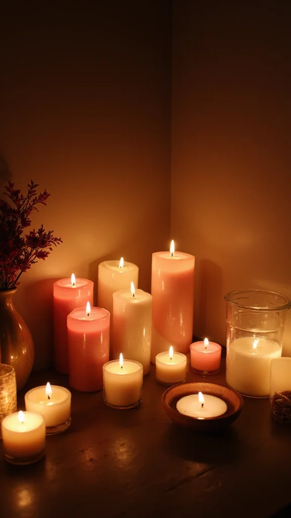 Candles create a warm, inviting glow in a focused corner. Mix pillar candles with tealights and votives for dimension. Set them on a small table or windowsill to cast a soft ambient light. Scented options deepen the romance. Flameless choices work well in tight spaces for safety.