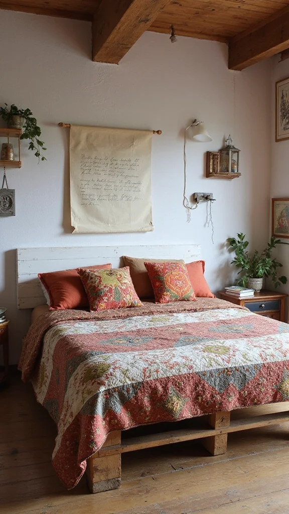 Vintage charm starts with a white headboard paired with a rough-hewn pallet bedframe. The bright white balances the dark, weathered wood for a cozy contrast. A touch of color comes from quilts or textured throws at the foot. Pinterest loves upcycled ideas like this, showing rustic pieces can feel chic.