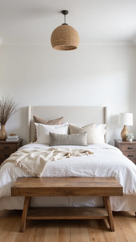 - 10. Layered Textiles with White Headboard and Wooden Bench