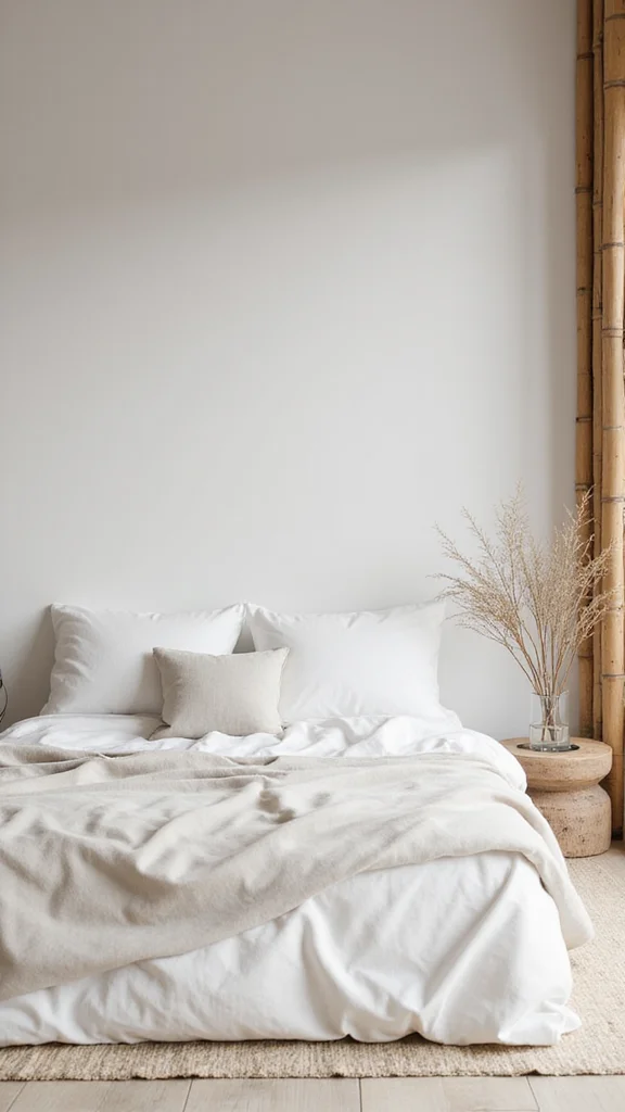 Zen rooms feel quiet when a white headboard meets bamboo accents. This pairing sparks calm and focus.