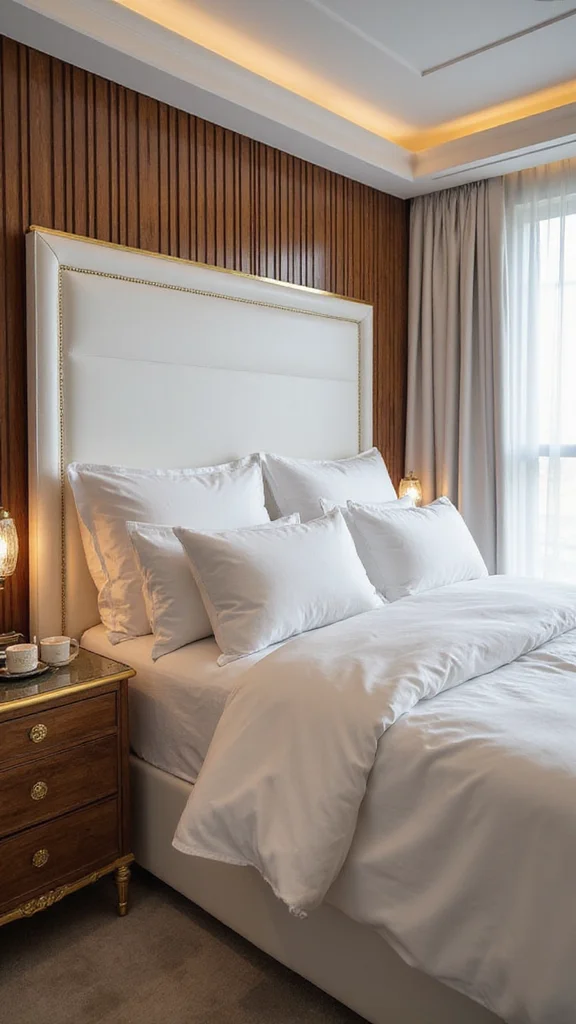 - 12. Glamorous Touch with White Headboard and Wood and Gold