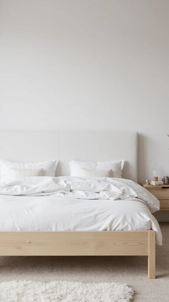 A clean white headboard anchors a calm, minimalist bedroom. Natural wood nightstands soften the look with warm texture. Keep lines simple and avoid clutter to let light flow. This style echoes current minimalism trends seen in design guides.
