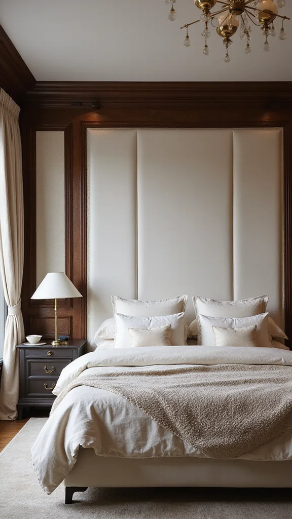 Turn your white headboard into a luxe focal point by pairing it with dark wood crown molding. Layer silk textiles and warm lighting to soften the contrast, then frame the bed with molding and finish with one bold art piece. Timeless and inviting.