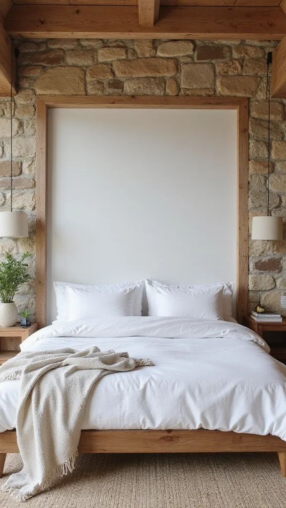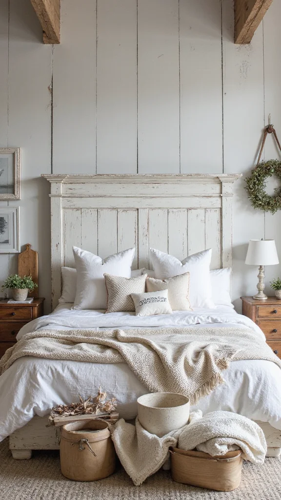 Start with a white headboard and weathered wood accents, then layer plaid throws and burlap cushions for a cozy farmhouse vibe. Keep creamy, muted tones to let textures shine—it’s the little details that warm up the room.