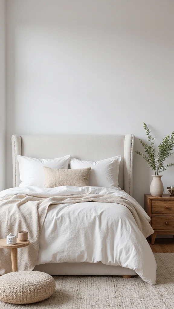 Layered neutrals create calm and ease in any room. A white headboard sits among warm wood tones for balance. Different textures keep the look lively yet soft.
