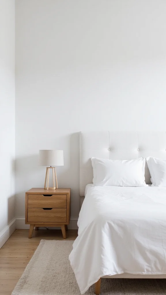 - 2. Minimalist White Headboard with Natural Wood Nightstands