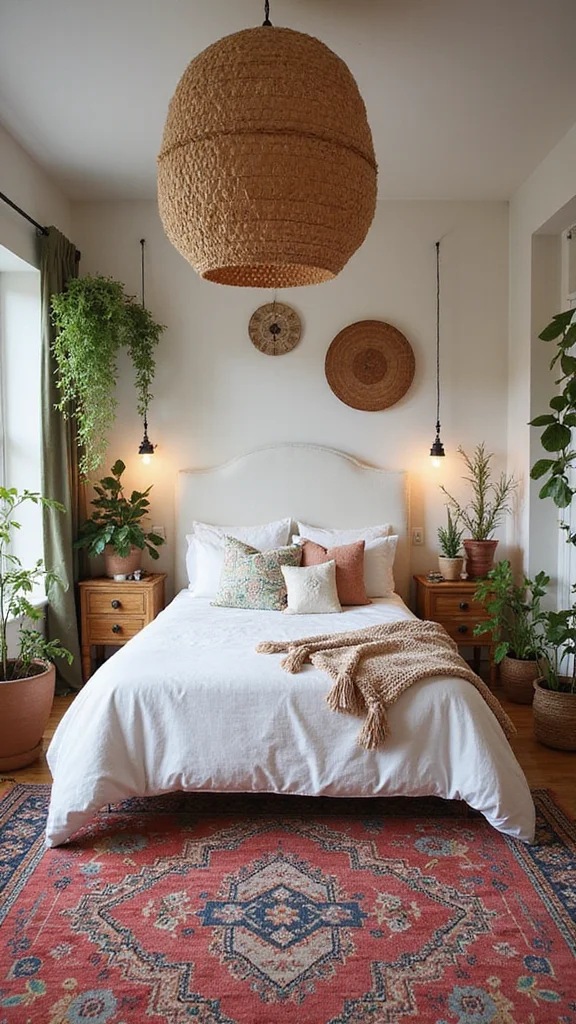 3. Bohemian Style with White Headboard and Warm Wood Decor