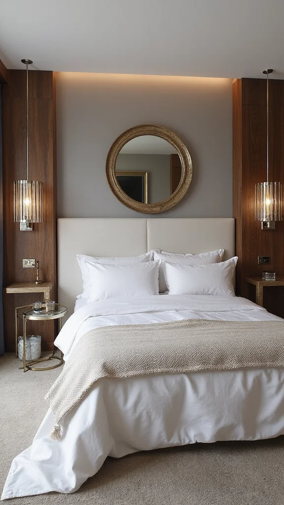 Glam comes alive when warm wood meets gold accents. A white headboard acts as a clean stage. Layer velvet textures for richness and pair brass lamps for sparkle. Use one or two gold pieces to avoid overpowering the room.