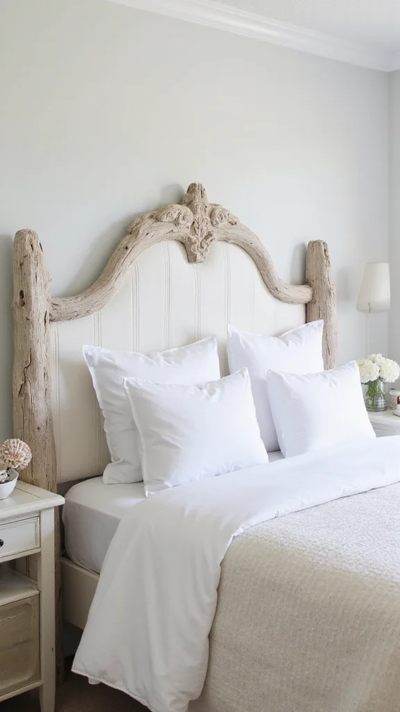 7. Coastal Vibes with White Headboard and Driftwood Features