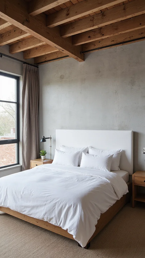 - 8. Industrial Charm with White Headboard and Exposed Wood Beams