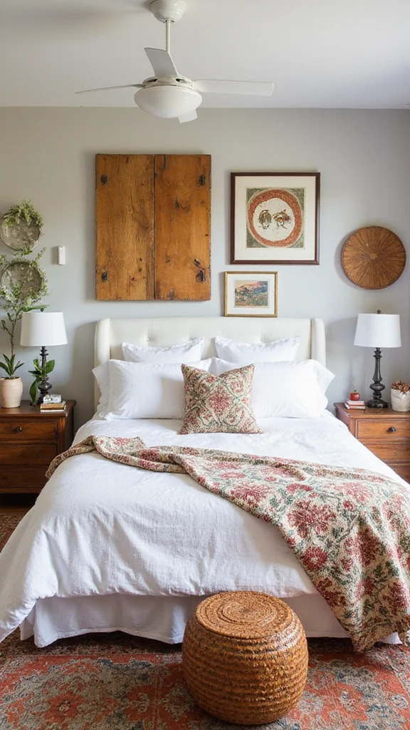 - 9. Eclectic Mix with White Headboard and Warm Wood Art