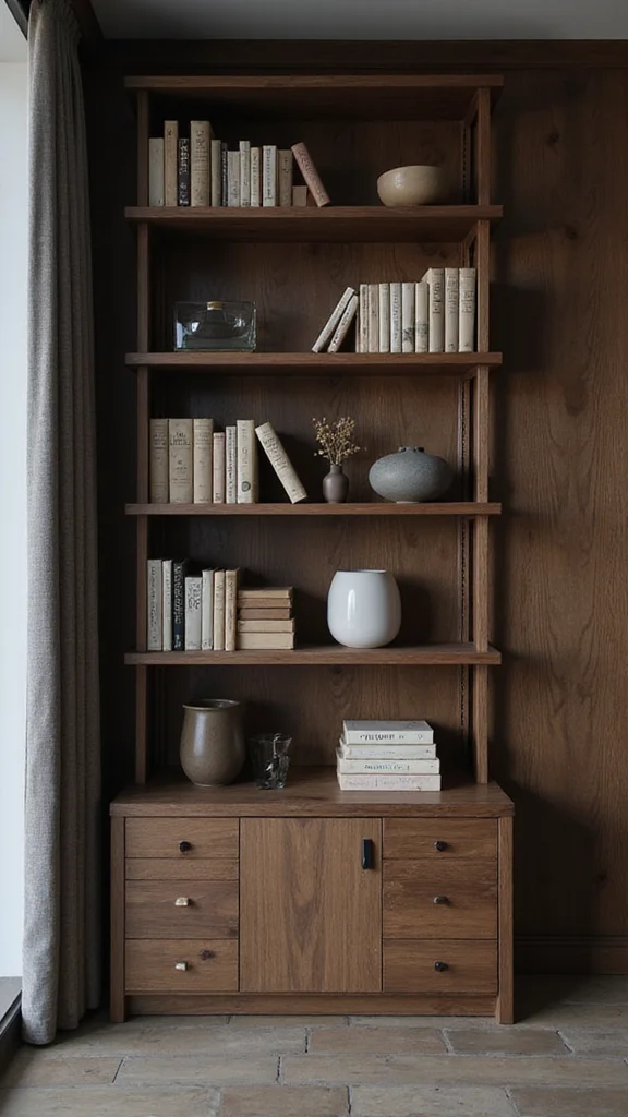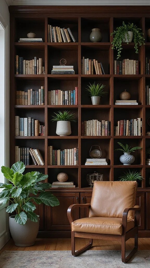 Bookshelves show taste and life. Dark wood shelves fit the theme. Keep a neat display with a mix of books and objects. This adds depth and a focal point.