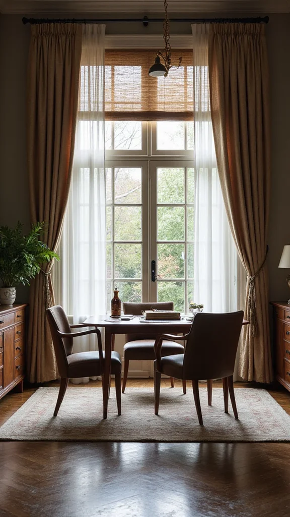 Use sheer curtains with sturdy blinds for flexibility. Choose dark or neutral hues for masculine vibe. Place treatments to frame windows neatly. Add layering for privacy and light control.