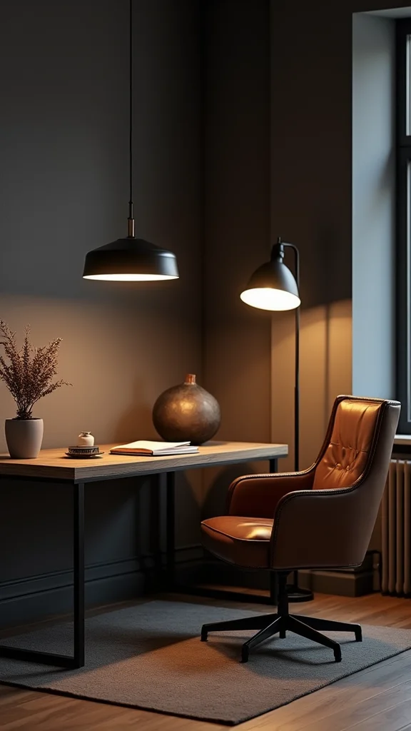 Lighting sets mood in a masculine office. Choose fixtures with metal or dark finishes. Industrial pendants or bold floor lamps are on trend. Pinterest shows layered lighting that adds depth.