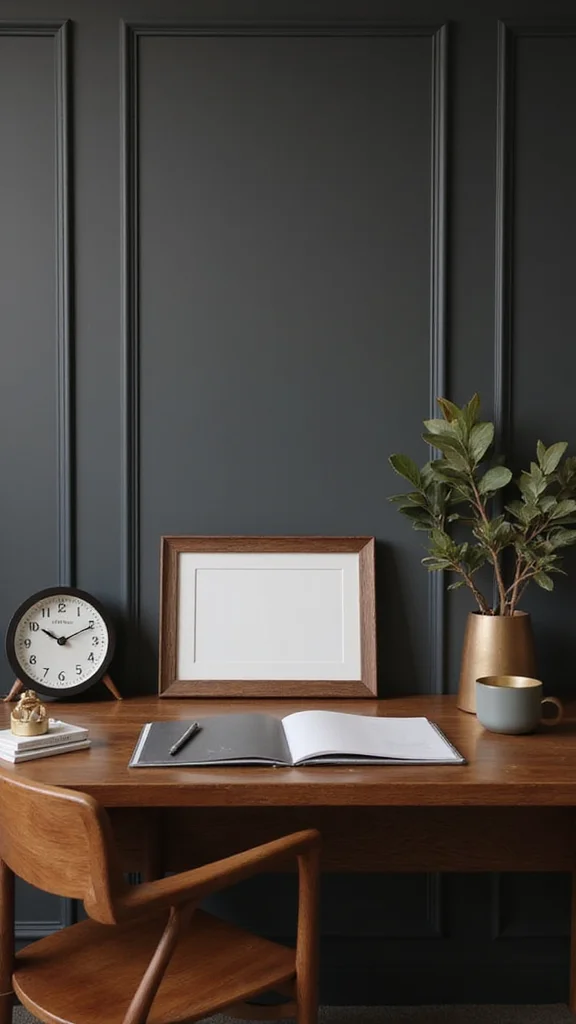 Dark wood accents knit the room into one story. Frame, clock, and desk accessories all in the same finish. They warm the space without stealing focus. This approach matches modern masculine spaces.