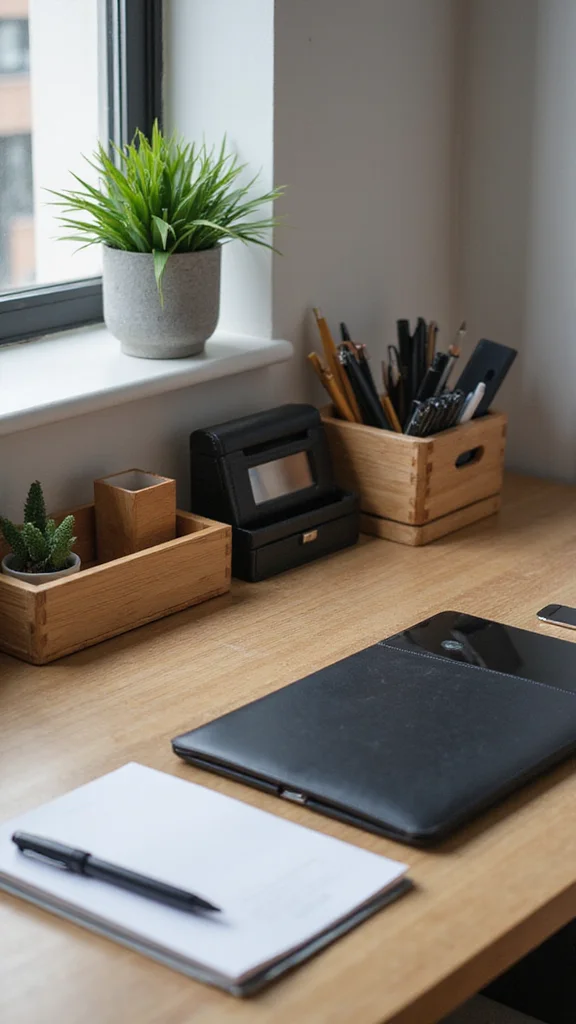Use drawer organizers to keep supplies neat. Choose matching materials for consistency. Pick desktop trays to tame papers. Add a personal item that inspires you.
