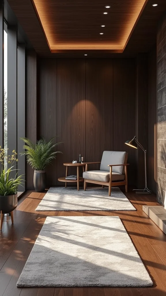 Dark wood floors bring warmth and a strong base. Pair with light rugs to define zones. Durability matters for busy offices. Bold floors are common in masculine designs.