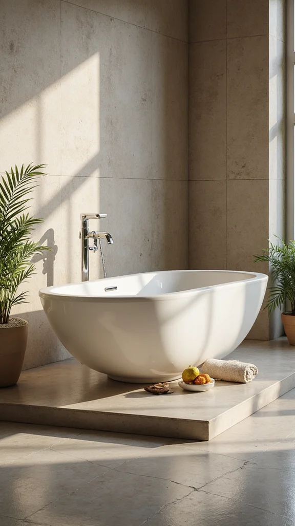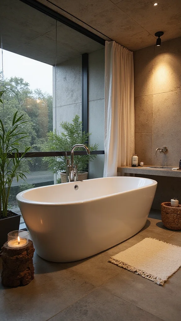 A sculptural tub becomes the room’s focal point. Choose natural stone or hand-crafted ceramic shapes that fit the theme. Position it where it earns attention as you enter or from the doorway. Soft lighting or nearby plants add drama and calm. Keep surrounding decor minimal to let the tub shine. A textured wall behind adds depth and interest.