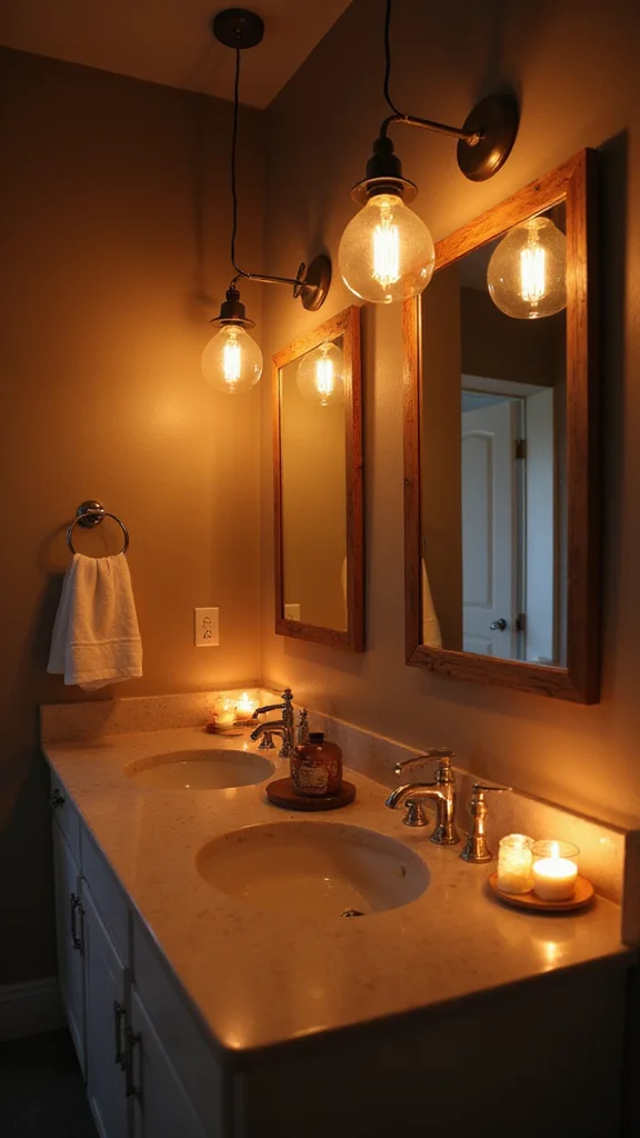 Lighting sets the room’s mood. Choose warm, dimmable bulbs to soften glow. Let in natural light with sheer curtains or a skylight. Candles add intimate warmth for evening routines. Layer task lights with ambient options for balance. Pick fixtures with wood or stone details. Keep cords tidy and avoid harsh glare. This setup invites slow unwinding.