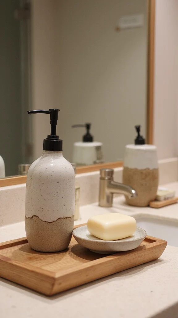 Accessories echo nature and minimalism in small ways. Think stone dispensers, bamboo trays, and cotton washcloths. Landscape or traditional prints finish the vibe without crowding. Keep colors muted so every piece feels part of one story. Mix textures to add depth without clutter. Rotate accents to keep the room feeling fresh.