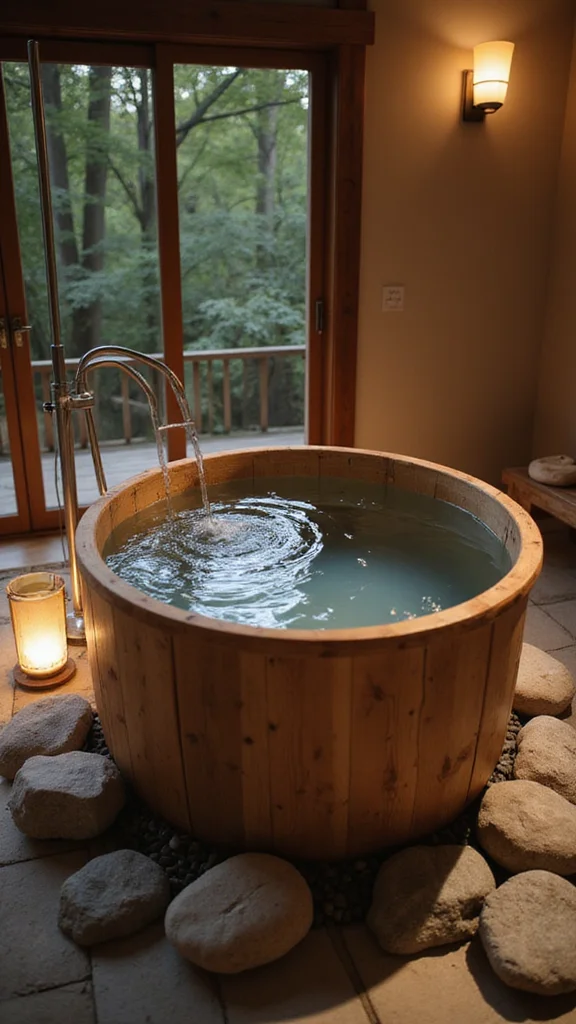 An ofuro offers authentic, serene bathing rituals. Cedar or hinoki wood fills the tub with a calming scent. Pair it with smooth stones and warm lighting for a spa-like scene. Wooden steps beside the tub invite easy entry. Keep the area around the tub simple to highlight this feature. Choose moisture-friendly finishes for durability in humidity.