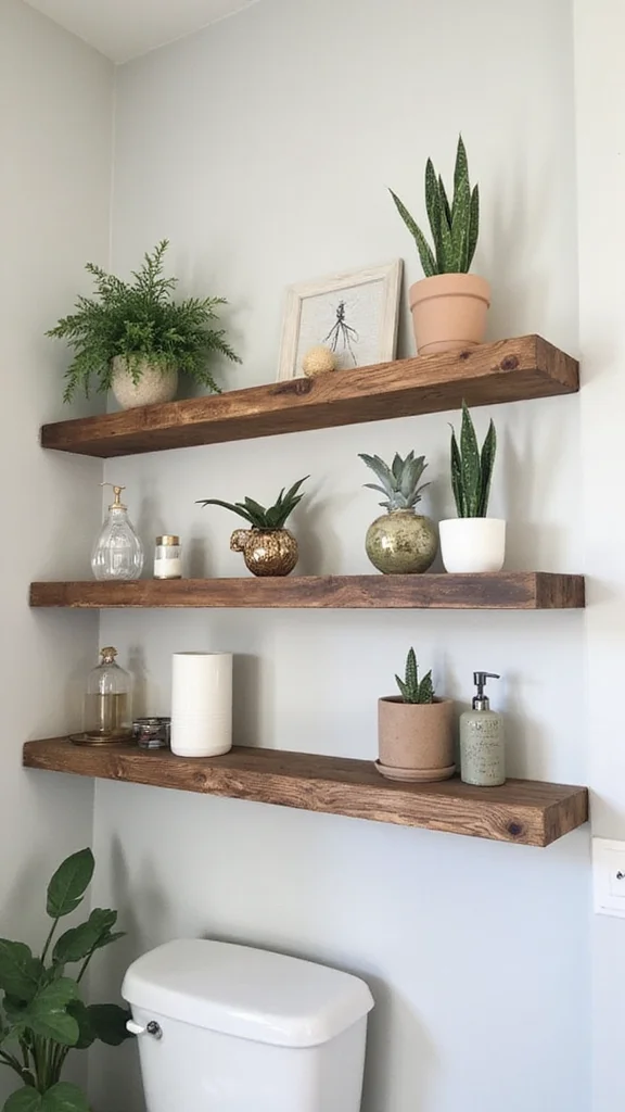 Floating shelves add storage while keeping the room airy. Reclaimed wood fits the natural vibe. Display towels, plants, and small decor in balanced groups of three. Hide clutter with closed storage boxes on the shelves. Keep things tidy with regular upkeep. Pair shelves with baskets to hide small items.