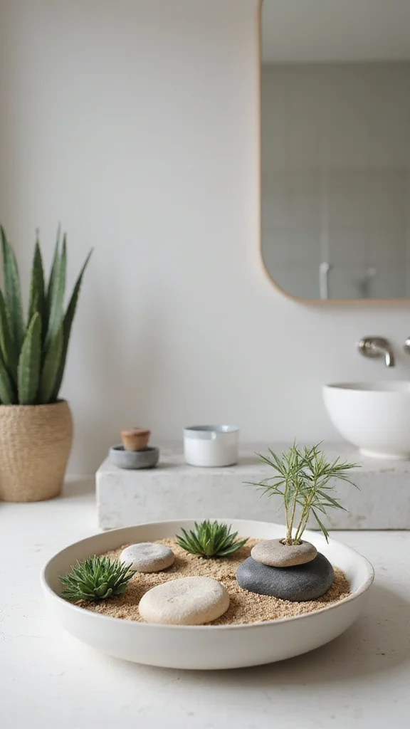 Brace your mornings: a tiny zen corner can reset your mood in minutes. Place a shallow dish, a few stones, and a moss plant, and watch your japanese style bathroom ideas turn into a calm, clutter-free retreat.