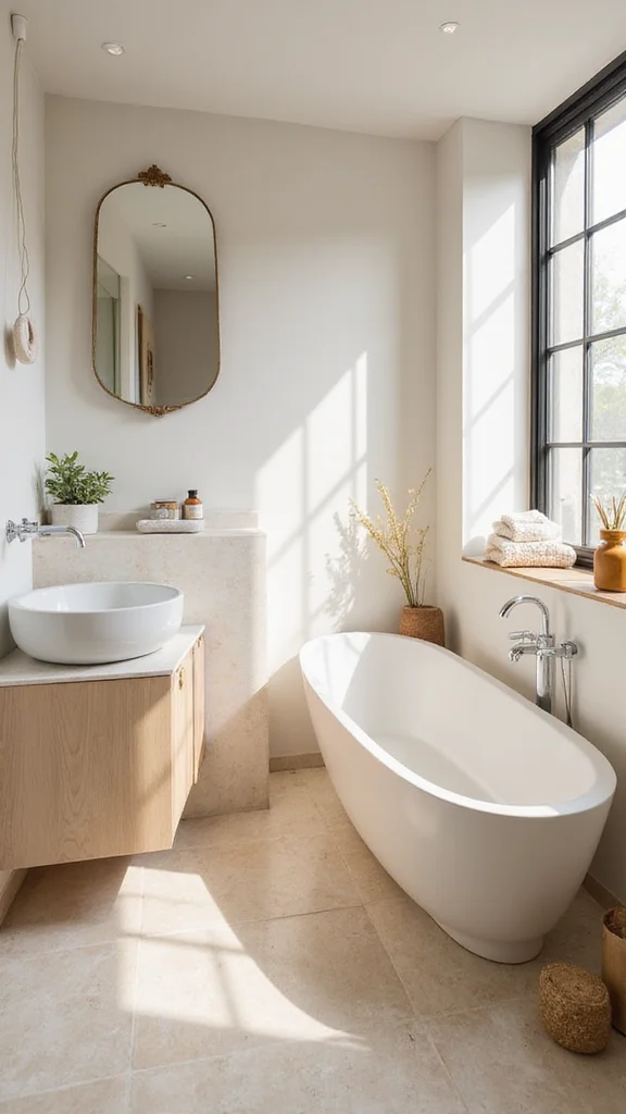 Open layouts boost calm and freedom in the bath. Avoid crowding with too much furniture; keep surfaces clear. Wall-mounted sinks and floating vanities create breathing room. Mirrors reflect light, making the room feel larger. Plants soften edges without adding clutter. Use baskets or boxes for hidden toiletries to stay tidy.