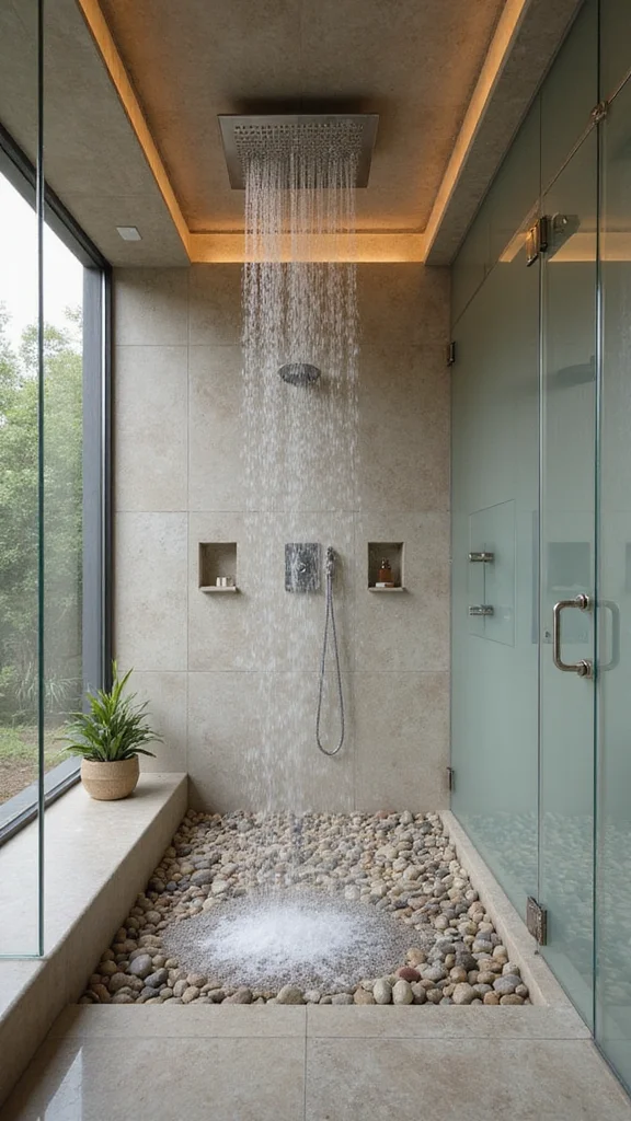 Turn showers into calm rituals with thoughtful design. A rainfall head delivers a gentle, wide spray like summer rain. Natural stone or tile in earthy tones echoes outside and grounds the space. A clear glass enclosure opens the area visually and keeps it tidy. Built-in niches hold soaps and scrubs for easy reach. Fresh scents like eucalyptus or lavender heighten the sensory calm.