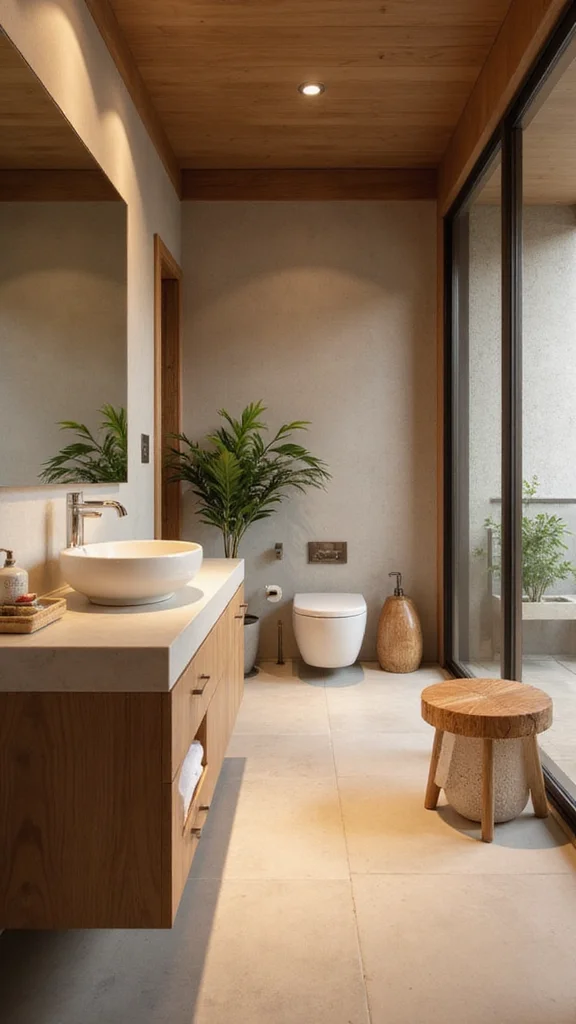 Use natural materials like wood or bamboo for vanities, shelving, or accents to bring warmth while keeping things calm.