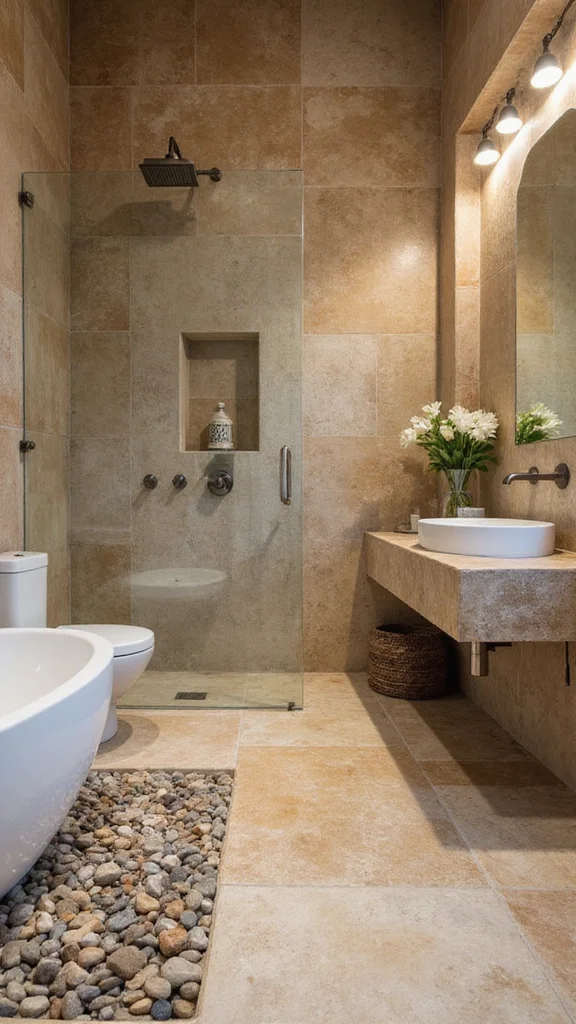 Earthy stone accents bring a grounded feel to your bath. River rocks around the tub or slate on a feature wall add tactile richness. A stone sink is a bold focal point that feels natural. Pair it with warm wood and soft textiles for balance.