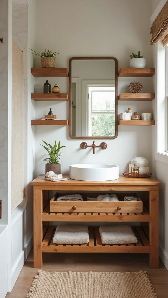 Open shelving adds air and practicality to a boho bath. It shows off towels, plants, and charming finds. The display feels casual and inviting when arranged with care. Shelves in reclaimed wood anchor the room.